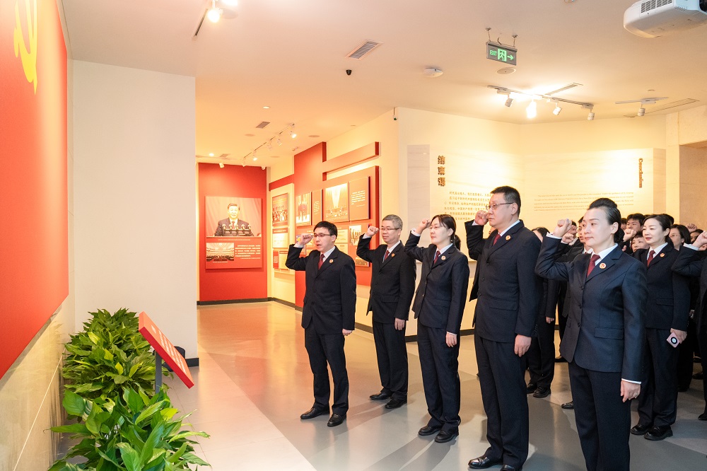 现场,全体党员干警身着检察制服,仪表庄重。在馆内鲜红的党旗前,整齐列队,举起右拳,庄严宣读入党誓词。铿锵有力的誓言回荡在展厅内,不仅是对入党初心的再次叩问,更是对忠诚履职、廉洁奉公的郑重承诺。