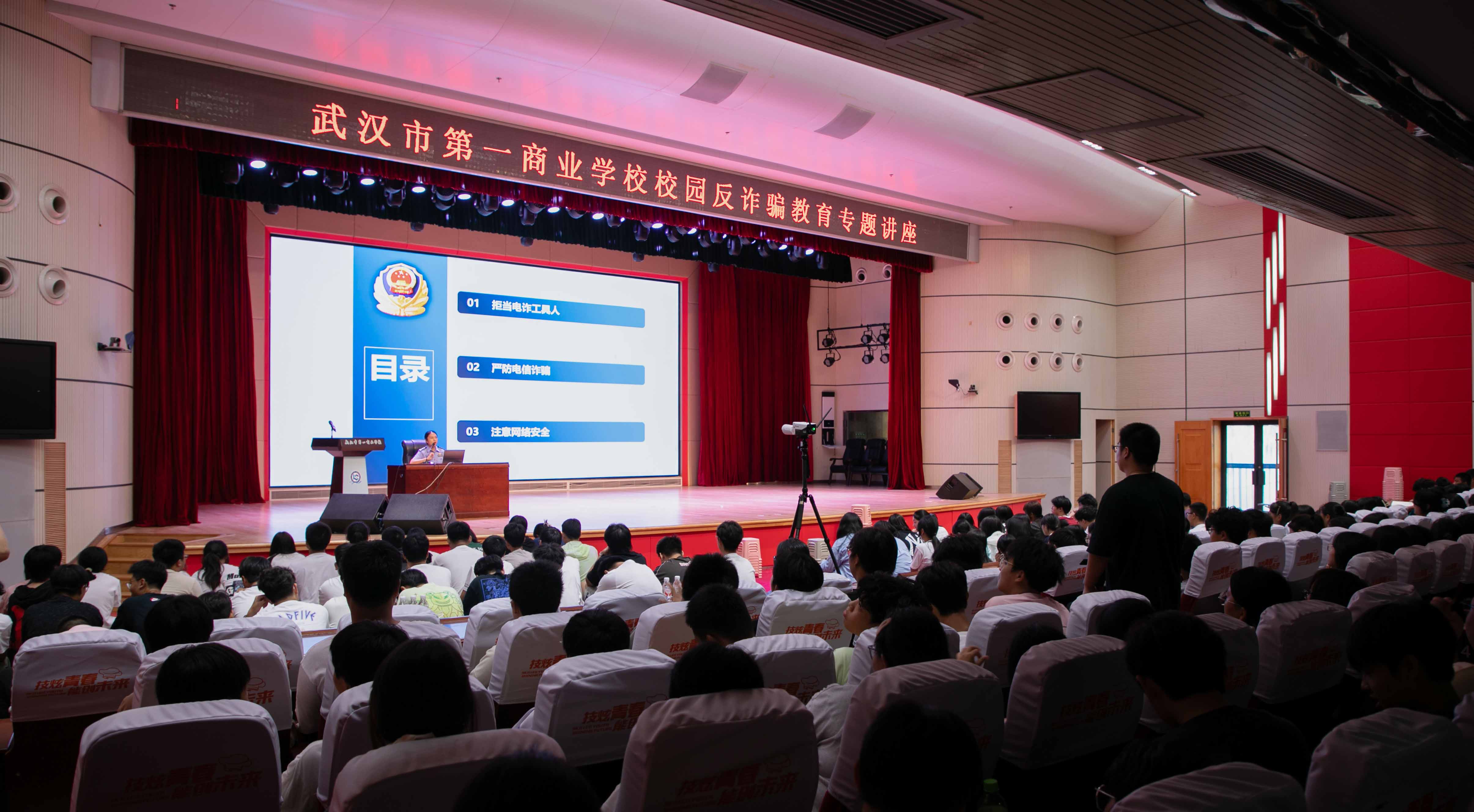 来自武汉市反电信网络诈骗中心的二级警长杨雅迪与市检察院未成年人检察部一级检察官助理王丹一同以“中学生如何防范电信网络诈骗”为题,向武汉市第一商校的同学们讲解有关电信网络诈骗的相关知识。