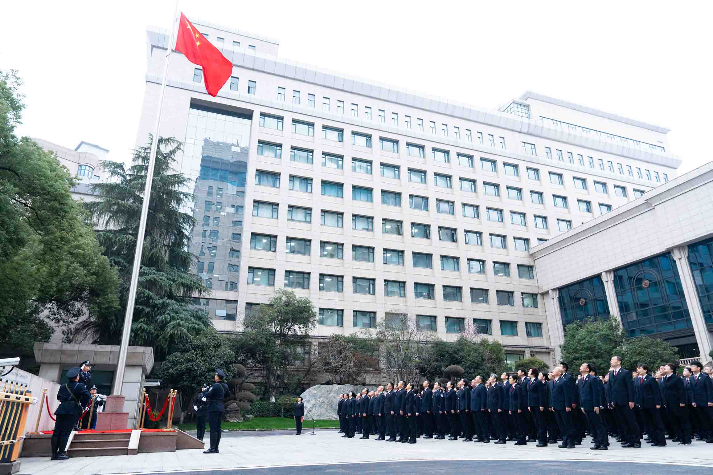 “升国旗,奏唱国歌,全体人员向国旗行注目礼!”雄壮激昂的《义勇军进行曲》响起,五星红旗迎风展开、冉冉升起。全体干警肃然而立,目光如炬,向国旗致以最崇高的敬意。