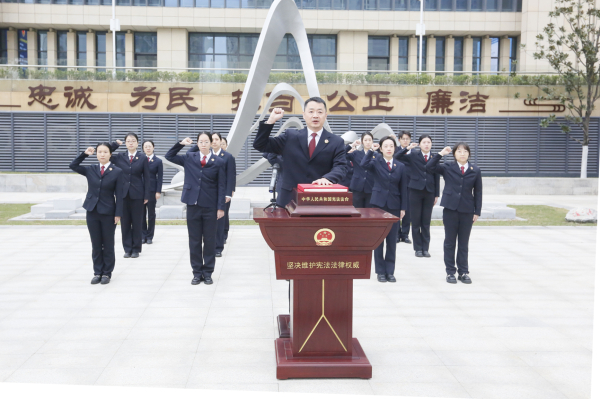宣誓仪式现场国旗鲜艳,宪法庄重,气氛肃穆。上午九时,仪式在雄壮的中华人民共和国国歌声中开始。本年度职级晋升人员及新入职干警整齐列队,精神饱满。在监誓人的注视下,党组成员、副检察长林江左手抚按《中华人民共和国宪法》,右手举拳,领诵誓词。全体宣誓人面向国旗,高举右拳,跟诵誓词,作出了对宪法、对国家、对人民的郑重承诺。誓言字字千钧,诠释着履职初心,承载着责任使命。