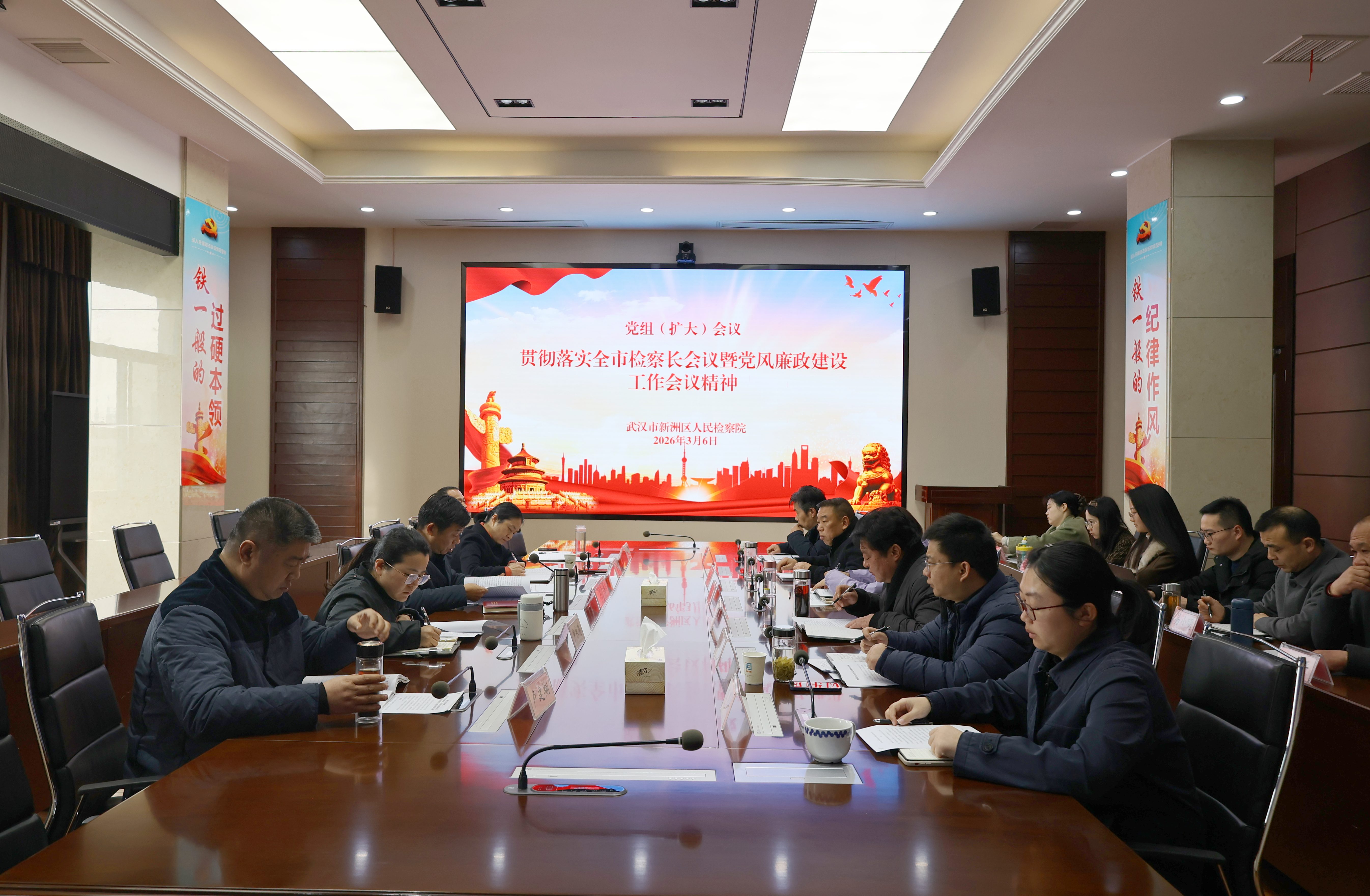 本网讯(通讯员 蔡晨)2026年3月6日,新洲区检察院召开党组(扩大)会,专题学习贯彻落实全市检察长会议暨全市检察机关党风廉政建设工作会议精神,研究贯彻落实措施。该院全体院领导、各部门负责人参加会议。